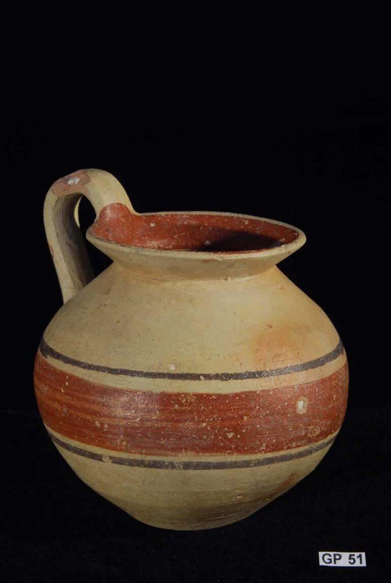 Crafted from fine buff clay, the olpe’s surface is smooth to the touch, reflecting a high degree of finishing skill. It is adorned with horizontally applied bands of red and brown, creating a stark and visually appealing contrast against the light clay background. These bands, strategically placed, accentuate the olpe’s curvaceous profile, drawing the eye upward from the base to the lip. The pigments used are derived from locally sourced minerals, ground and mixed with a medium that has allowed them to endure over millennia.