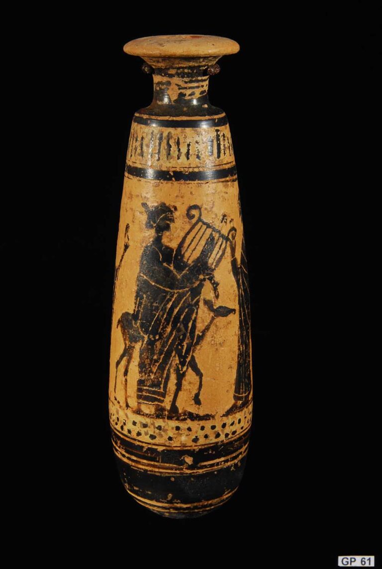 The cultural significance of this alabastron is profound, as it captures the essence of ancient Greek life, weaving together elements of mythology, religion, and daily practices. The artifact’s intricate decoration, featuring deities such as Hermes and Apollo, highlights the pervasive influence of mythological figures in Greek culture. These figures were not mere artistic embellishments but were integral to the spiritual and societal fabric, reflecting their roles in rituals and everyday activities.
