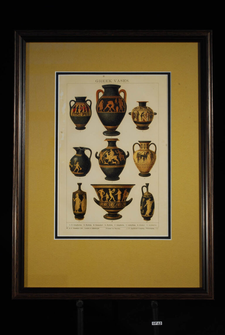 This print is a standout feature of our museum’s collection, offering visitors a comprehensive visual guide to the evolution of Greek pottery. Displayed prominently, it plays a crucial role in enriching the museum experience, allowing visitors to appreciate the finesse and diversity of ancient Greek artistry through beautifully rendered ceramic forms. This exhibit not only draws attention to individual artistic achievements within the Greek pottery tradition but also highlights the broader historical and cultural contexts of these works.