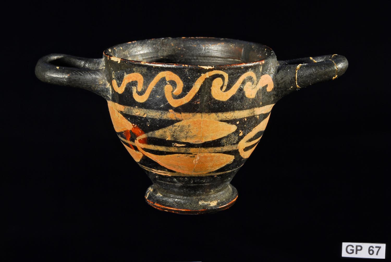 The decoration on the kylix does not merely serve an aesthetic purpose but also reflects the cultural and symbolic motifs prevalent in Greek society. The swirling patterns are reminiscent of the natural world, possibly evoking the swirling rivers and seas that were central to Greek mythology and life. Furthermore, the choice of orange against a dark background may symbolize the perpetual interplay between light and darkness, a theme deeply embedded in Greek philosophical and mythological thought.